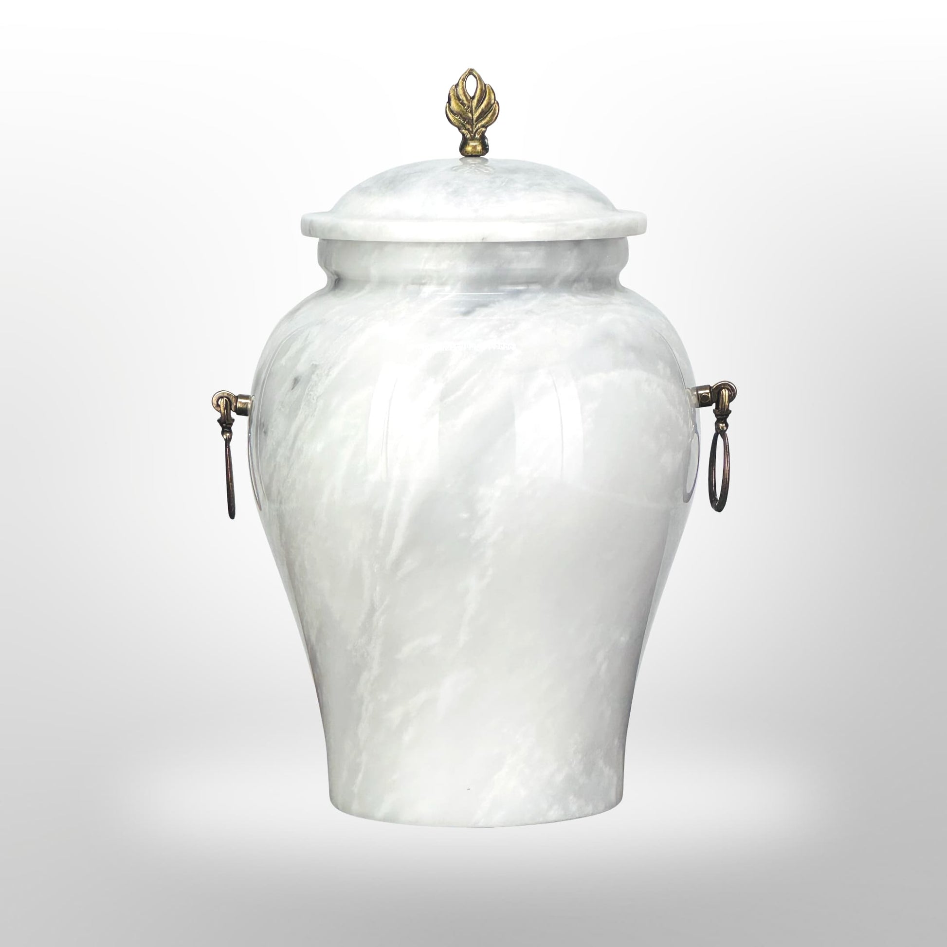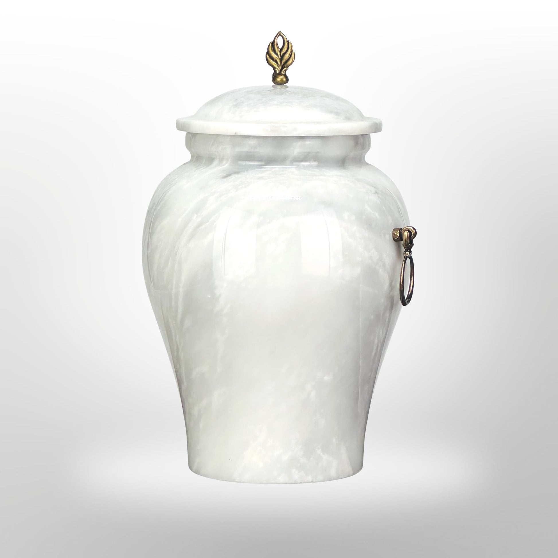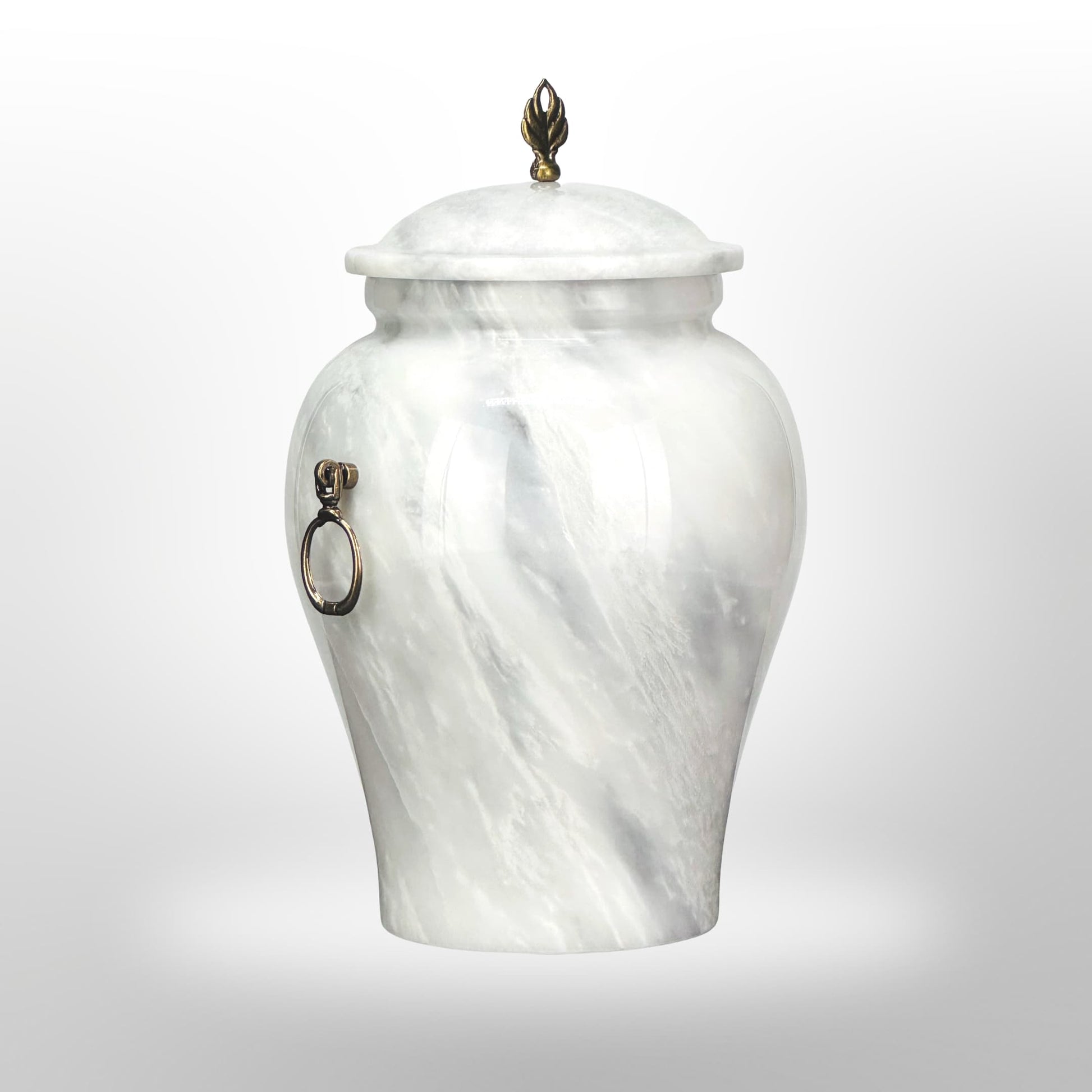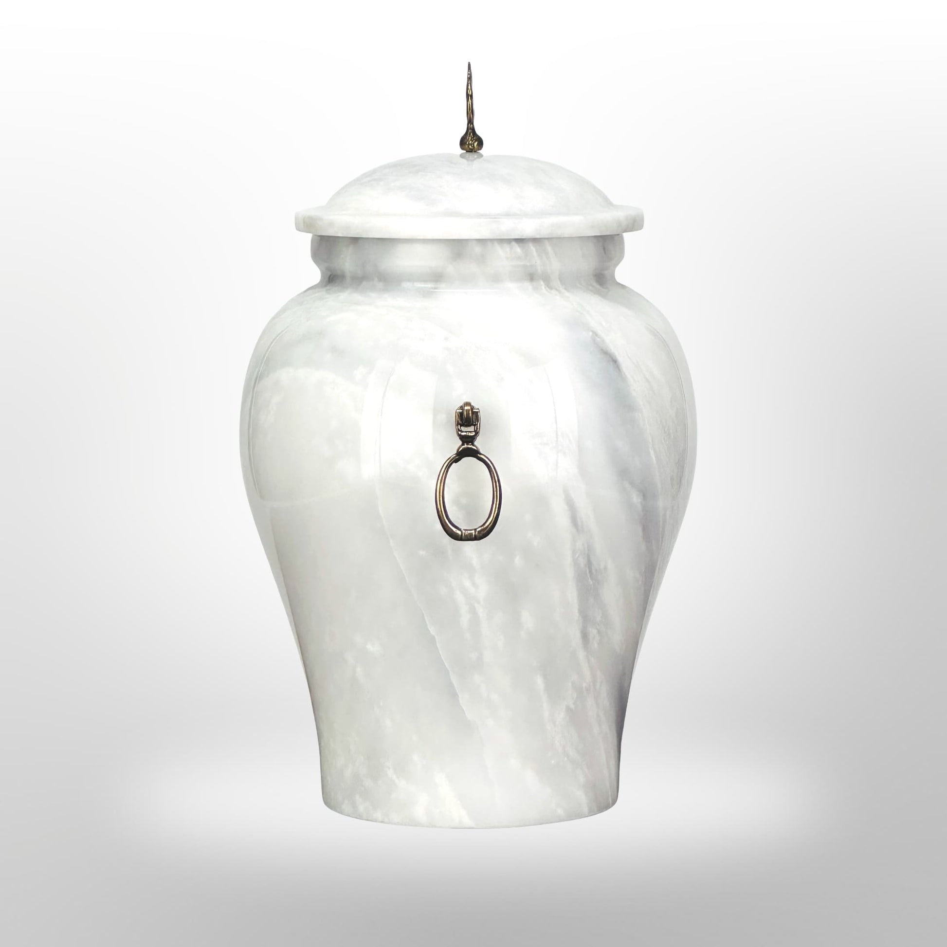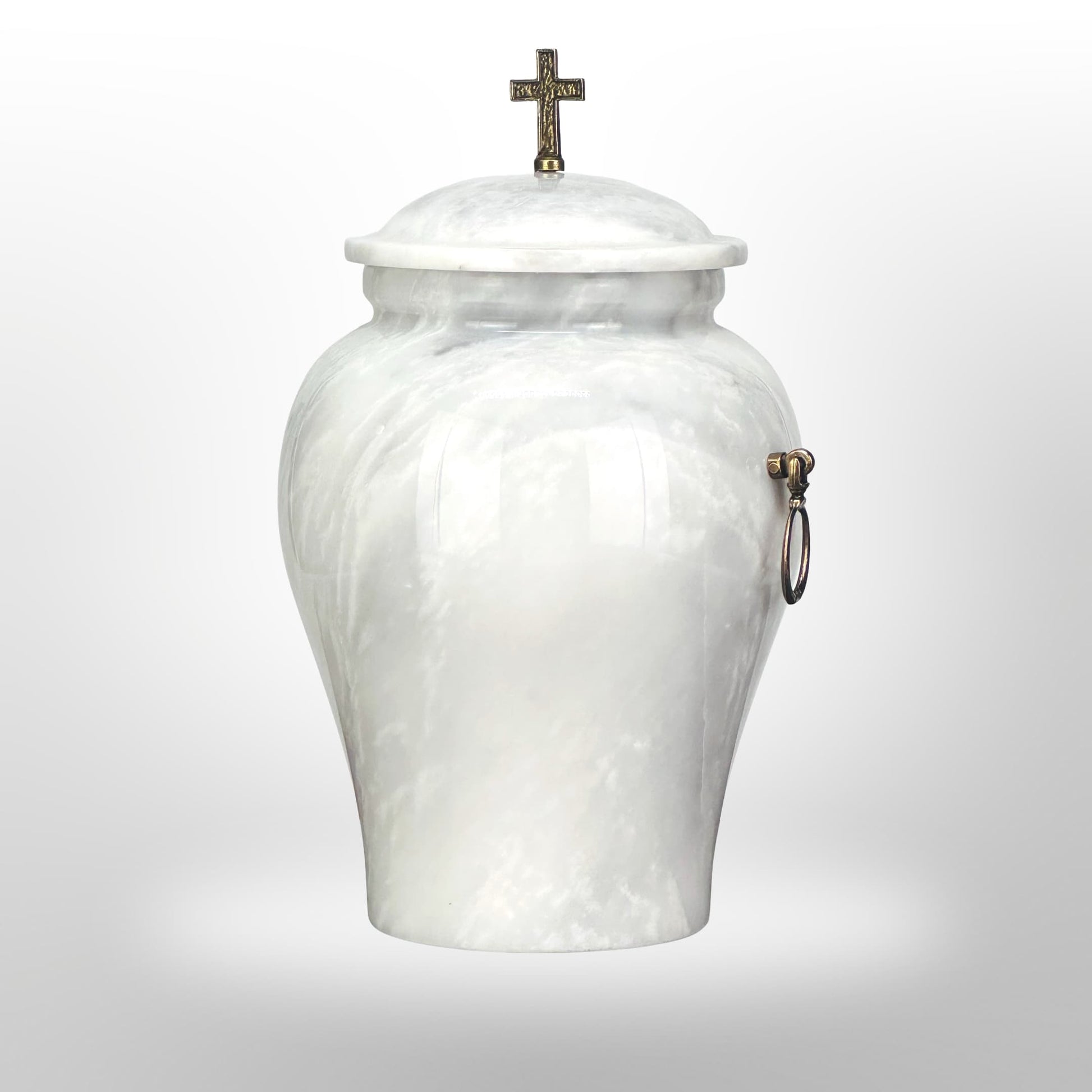 Klassische Urne aus weißem Naturstein. Mit einer Höhe von ca. 28 cm, einer Breite von ca. 20 cm und einem Volumen von rund 4 Litern bietet sie genügend Platz für eine würdevolle Aufbewahrung. Der Naturstein macht jede Urne einzigartig in Struktur und Farbe. Zeitlos im Design, stabil und langlebig – geeignet für eine Beisetzung oder zur Aufbewahrung zu Hause.